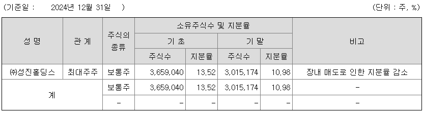 - 국내 상장사들 최대주주 평균 지분율이 20~30%인데, 이 회사의 최대주주 지분은 10%에 불과합니다. 경영권방어에 취약할수 있음을 의미하며, 외부 세력의 경영 개입 가능성이 높다는 점에서 리스크 요인이 됩니다.