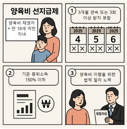 즉, 양육비 선지급제는 한부모가 아무런 조치 없이 바로 신청할 수 있는 제도가 아니라, 먼저 양육비를 받기 위한 공식적인 방법(소송, 집행, 제재 등)을 실제로 시도했다는 증거가 필요합니다. 이는 제도의 남용을 막고, 국가가 대신 지급한 양육비를 비양육 부모로부터 효율적으로 회수하기 위한 장치입니다
