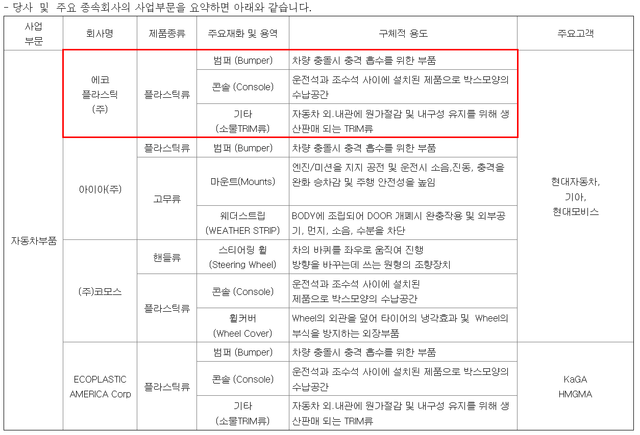 에코플라스틱은 자동차 내·외장 부품(예: 범퍼, 트림 등)을 대량으로 생산하는 기업입니다.