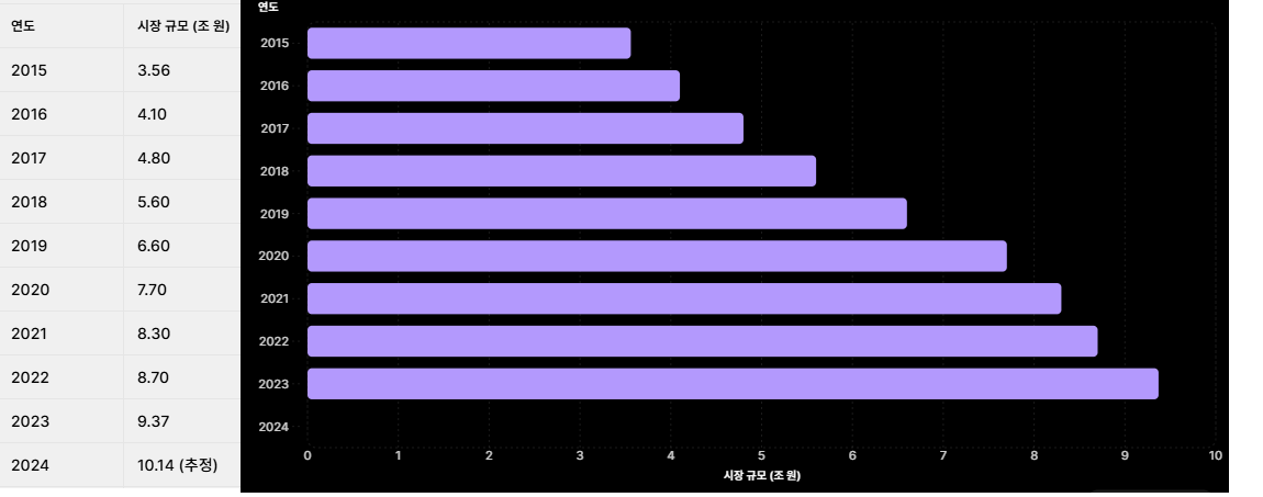 - 2024년에는 10조 1,358억 원으로 추정되어 사상 처음으로 10조 원을 돌파할 전망입니다.