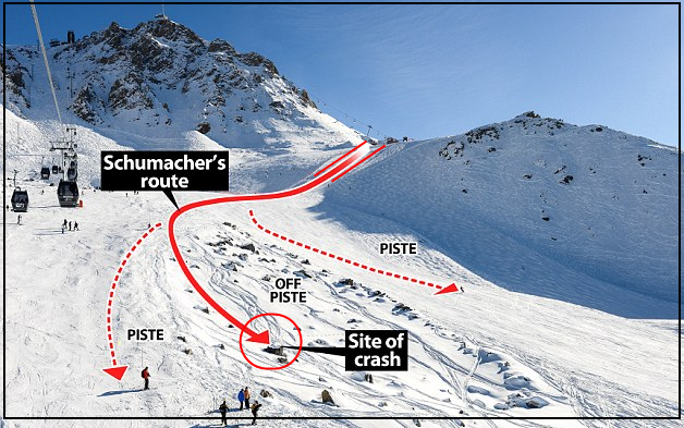 사고 현장에 처음 도착한 사람 중 한 명은 그날 일하던 스키 강사였습니다. 강사 앙드레는 그날 비포장 구역에서 스키를 타기에 눈이 충분하지 않다고 슈마허에게 경고했지만, 슈마허는 바위가 눈 밑에서 튀어나오는 위험한 산악 지역으로 계속 나아갔습니다. 앙드레가 사고 현장에 도착했을 때 슈마허는 여전히 의식이 있었습니다. 그는 아마도 바위 중 하나에 걸려 넘어져 다른 바위에 머리를 부딪혔을 것으로 보입니다. 헬기로 이송될 때 그의 상태는 급격히 악화되어 지역 병원 대신 그르노블로 비행하기로 결정되었습니다.