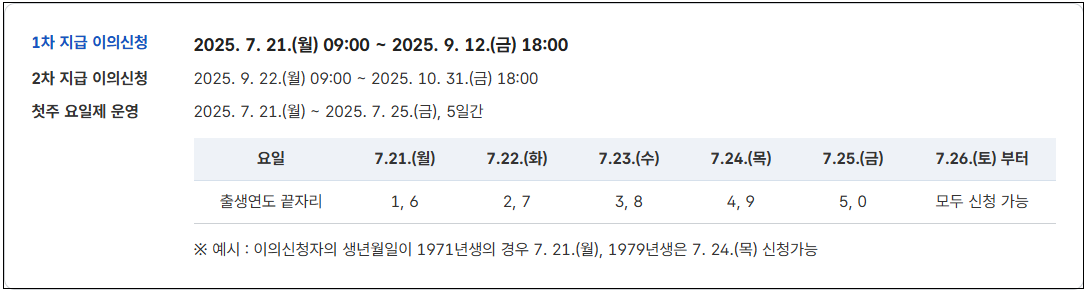 A1. 2025년 7월 21일부터 10월 31일 오후 6시까지 신청 가능하며, 첫 주는 요일제입니다.
