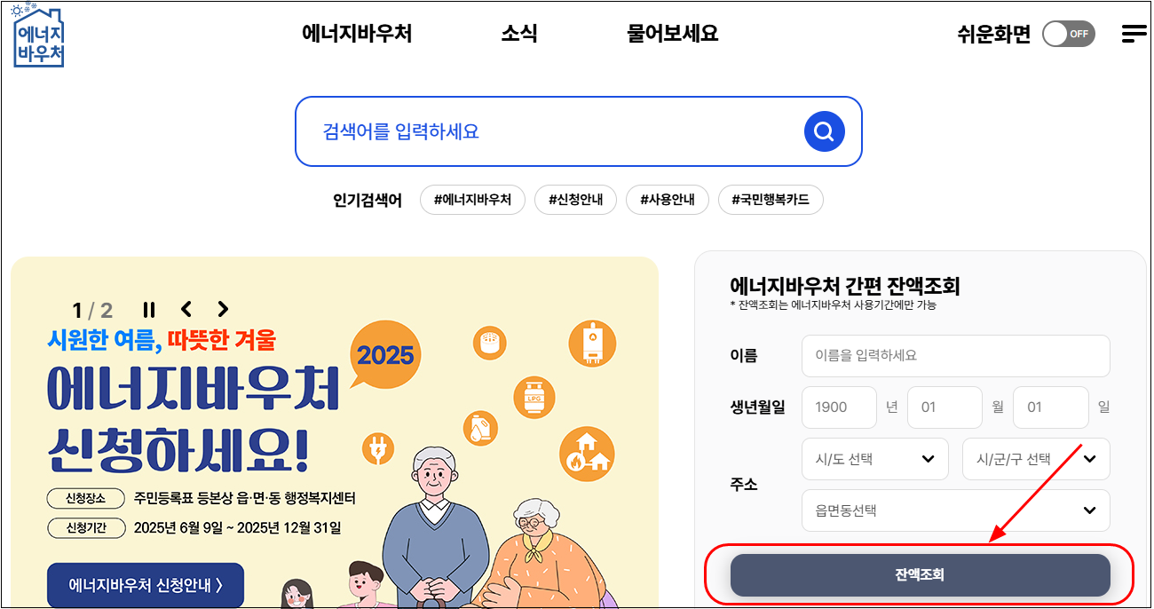- 에너지바우처 홈페이지 접속 후 ‘잔액 조회’
