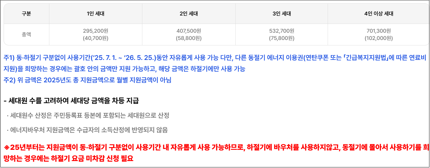 에너지바우처 지원금은 가구원 수와 계절에 따라 차등 지급됩니다.