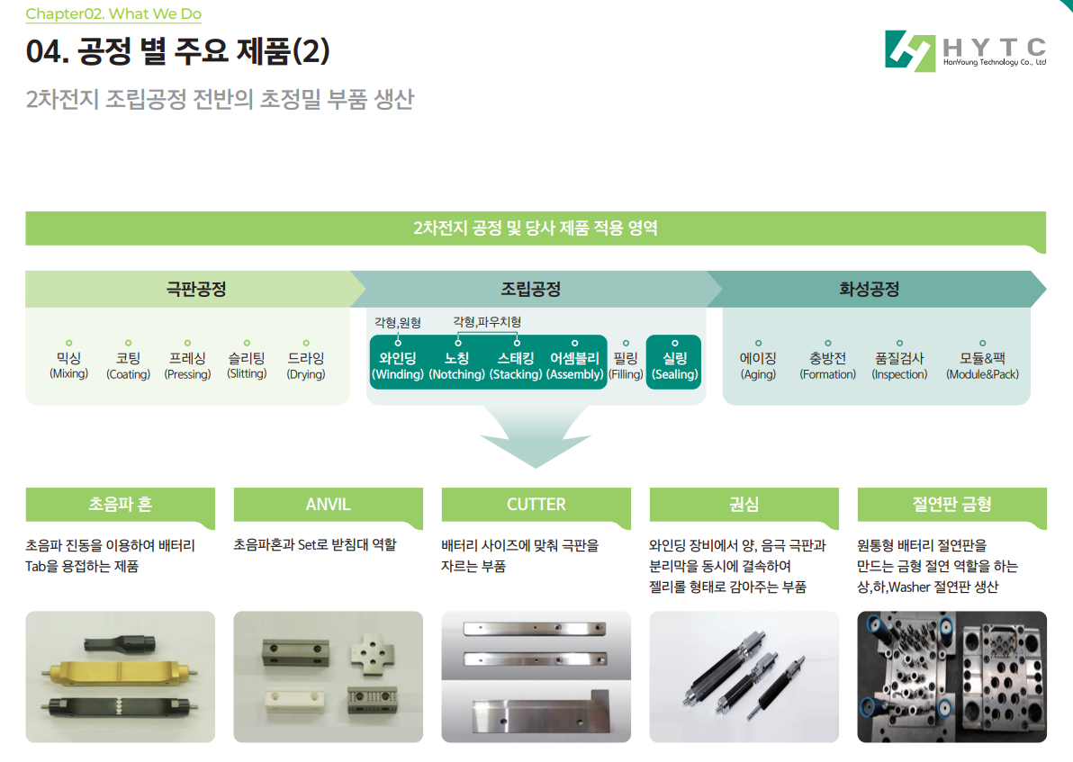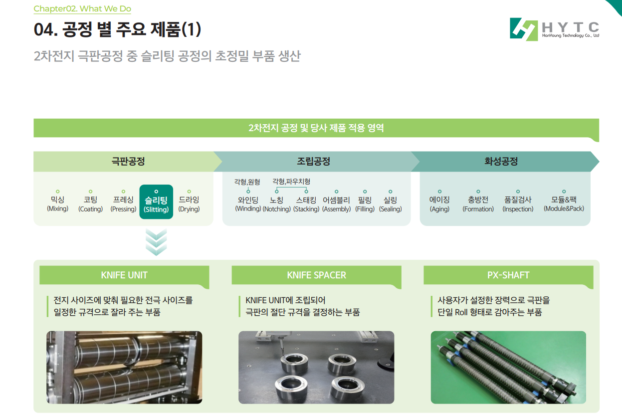1. 2차전지 장비업체 소모품을 생산한다는 것이 특징입니다. 한번 납품하고 끝나는 장비와는 달리 소모품은 지속적인 매출이 발생하기에 수익성이 더 좋습니다. 게다가 에이치와이티씨는 기술력이 필요한 초미세 정밀 소모품이기에 경쟁력이 있습니다