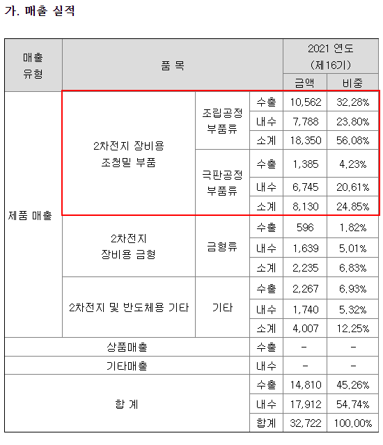 CUTTER, PX-SHAFT, 권심, 초음파혼이 매출중 가장 큰 비중을 차지하고 있습니다. 2차전지 장비 부품이 주요 매출입니다
