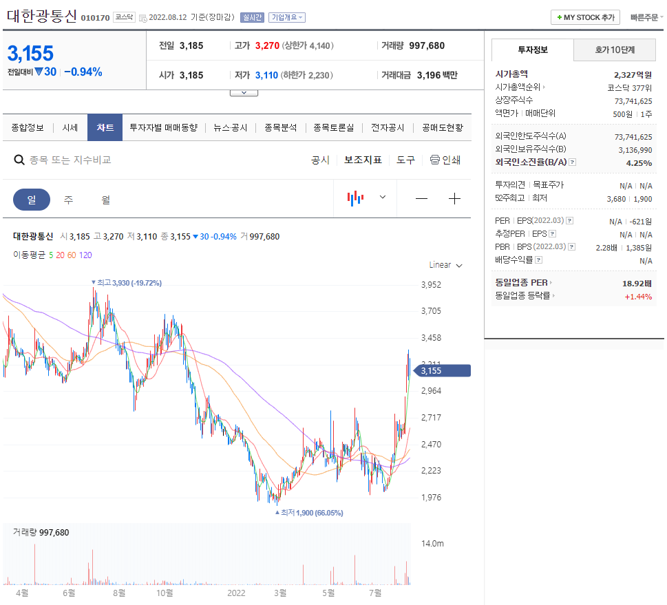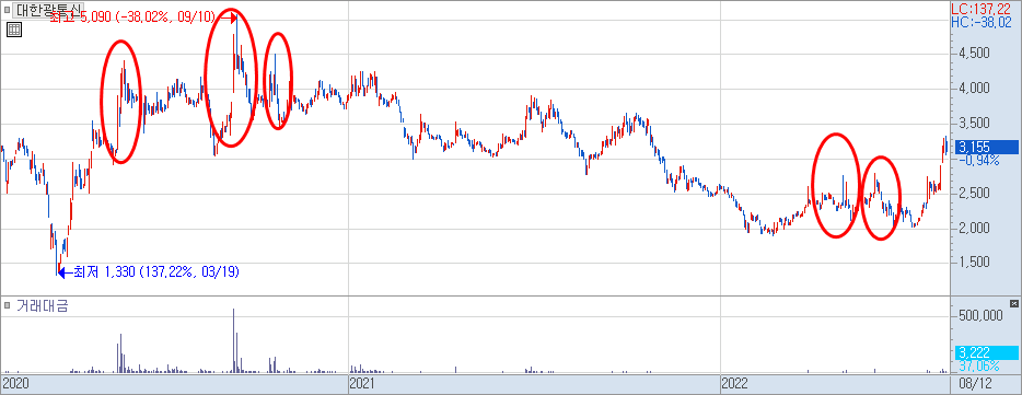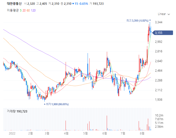 2022.06.07. 전세계 광섬유 공급난 영향으로 대한광통신 주가 상승