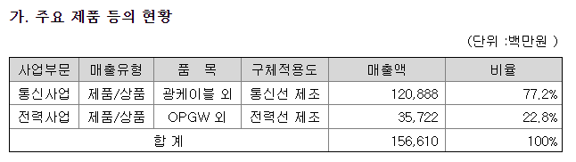 대한광통신은 광케이블 생산업체입니다. 우리나라에서 광케이블 생산기업은 LS전선, 대한광통신 2군데 뿐입니다. 원래 대한전선의 자회사로서 광섬유를 생산하다가 2011년에 광통신케이블사업부를 양수하면서 광섬유와 광케이블 모두 생산하게 되었습니다. 현재 모재부터 광케이블까지 모두 생산 가능한 국내 유일 수직계열화된 업체입니다. 그리고 CAPA 1위의 국내생산능력을 보유하고 있습니다.