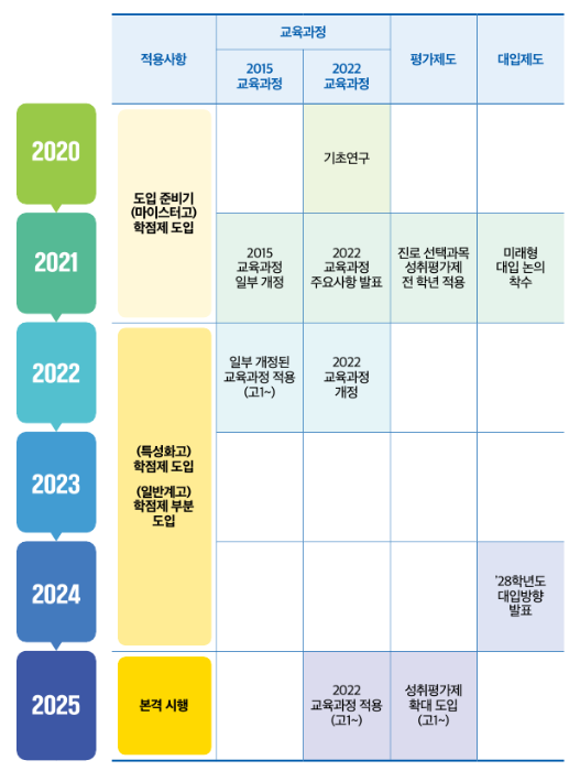 2024년에 시범운영이 시작되고, 2025년 기준으로 현 중학교 1학년생부터 정식으로 적용되어집니다.