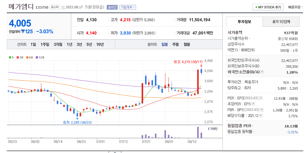 그중에서도 큰 거래대금과 함께 상한가를 간 유일한 종목이 메가엠디입니다.