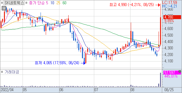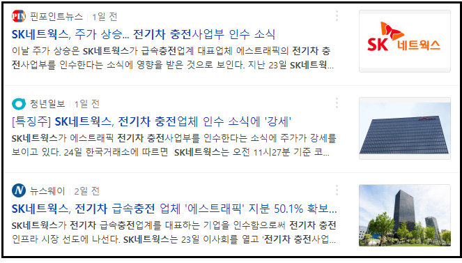 그러던중 SK네트웍스가 에스트래픽의 전기차 충전사업부를 인수한다는 발표를 하면서 8월 24일 두 회사의 주가가 크게 상승하였습니다.