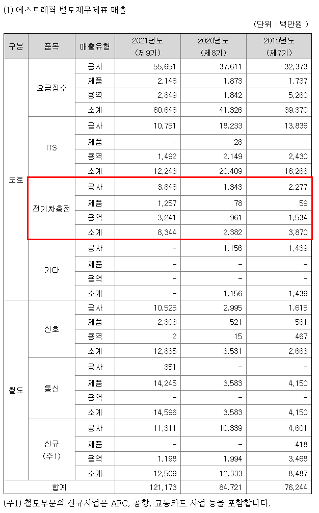 전체 매출은 1200억대지만 전기차 충전사업부는 80억대라 매출비중이 10% 아래였습니다.
