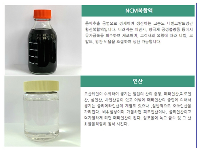 이후 반도체, 디스플레이 공정에서 나오는 폐산을 재활용하여 인산으로 재생산하는 사업을 하였고, 지금은 폐배터리에서 전구체복합액, 재활용 양극재를 분리하여 2차전지의 부원료로 다시 공급하는 사업을 하고 있습니다.