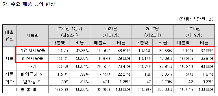 으로 사업부를 확대시키며 성장을 해왔습니다. 매출 비중은 폐전지가 가장 큰 비중을 차지하고 있습니다.