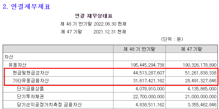 현금흐름은 영업현금흐름, 투자현금흐름, 재무현금흐름으로 나뉘며 영업현금은 플러스, 나머지 투자현금흐름과 재무현금흐름은 마이너스의 상태일때가 제일 좋습니다. 투자현금흐름의 마이너스는 투자로 인한 지출을 의미하며, 재무활동의 마이너스는 빚을 갚은것을 의미합니다. SJM의 경우 안정적인 영업활동으로 인해 현금이 많이 쌓이게 되었습니다. 2021년 기준 현금성자산과 기타유동금융자산은 800억이었고, 2022년 2분기 기준으로는 750억입니다.