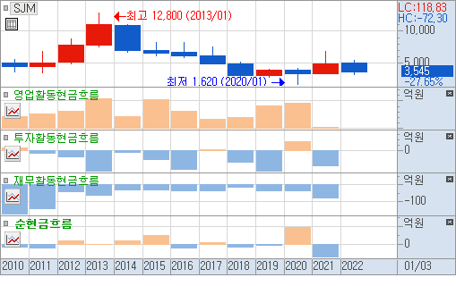 1975년 차동차 벨로우즈 국산화로 성장을 하여, 플랜트 산업용 벨로우즈까지 사업을 확장시켰습니다. 2010년대 내연기관의 성장성이 떨어지기 시작하면서 SJM의 매출도 같이 하락을 하게 되었고, 모아둔 현금으로 미래 신성장 동력을 MH기술개발의 배터리 냉각기술에서 찾으면서 회사를 인수하게 되어 전기차 배터리 관련주로 변하게 되었습니다.