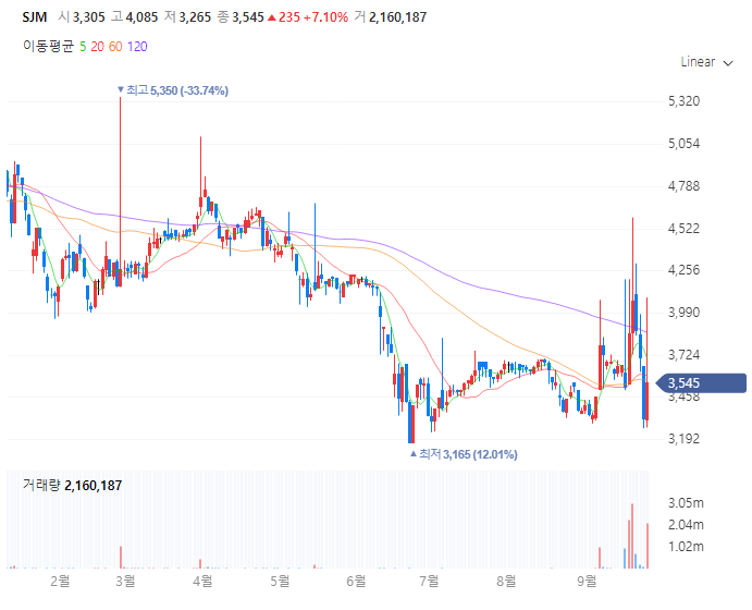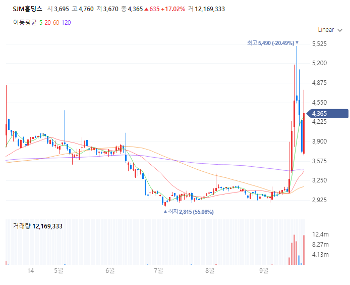 국토부의 혁신 모빌리티 로드맵을 발표한 9월 19일에 상승을 시작하여 이후 5500원까지 상승하였습니다. 그러나 가장 큰 거래대금도 600억을 넘지는 않으니 이 점 유의하시기 바랍니다. 현재 SJM홀딩스의 시가총액은 570억입니다.