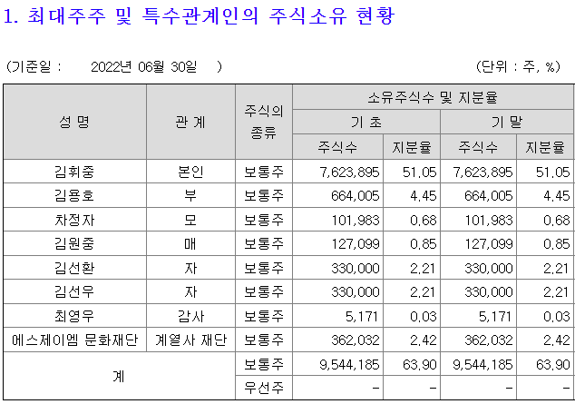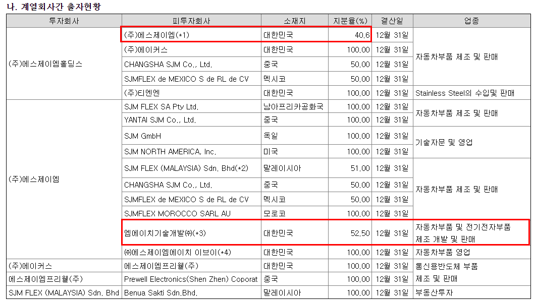 SJM홀딩스가 SJM의 지분을 40.6% 보유하고 있으며, SJM은 MH기술개발의 지분을 52.5% 보유하고 있습니다. SJM홀딩스는 지주회사입니다.