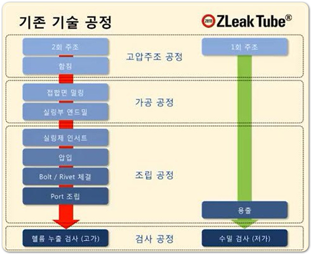 기존 열관리용 냉각 유로는 부품이 많고 긴 공정으로 인해 누수의 위험성이 있었습니다. 엠에이치기술개발의 핵심기술인 제로릭 튜브는 알루미늄 파이프와 알루미늄 고압주조공법을 결합하여 동종재질 성형접합 기술로 기존 배터리 냉각장치의 문제점인 냉각수 누출과 많은 공정으로 인한 높은 가격이라는 문제를 해결하였습니다. 간단히 이야기하면 예전에는 하우징을 상판과 하판을 따로 만들어 붙였기때문에 틈새에서 누수가 발생하였고 비쌌지만, 이제는 하나의 통으로 한번에 찍어내기 때문에 발생했던 문제가 없어졌습니다.
